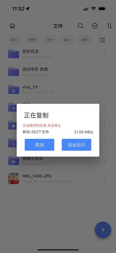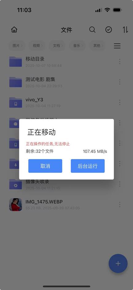 后台运行:移动操作将后台进行,可继续操作其他页面