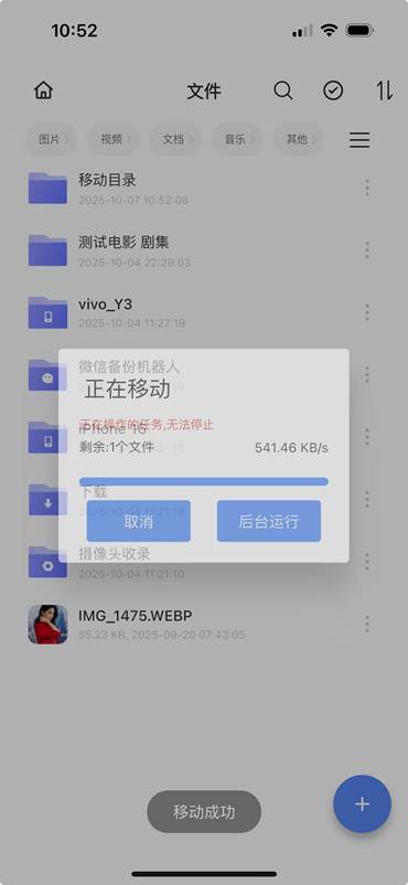 移动取消:移动中可取消操作,取消后只移动完成的文件,未移动完成的文件将保留在原目录下