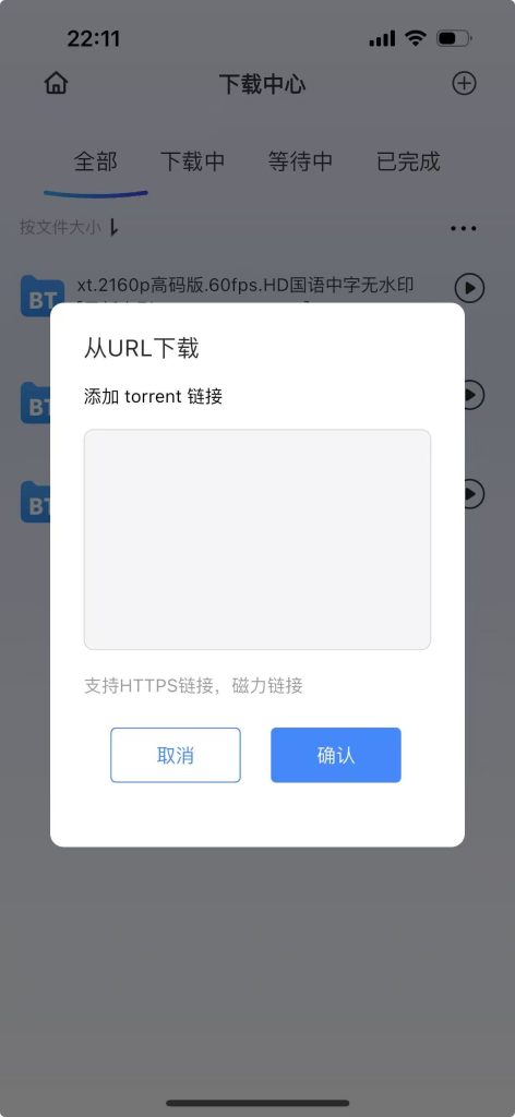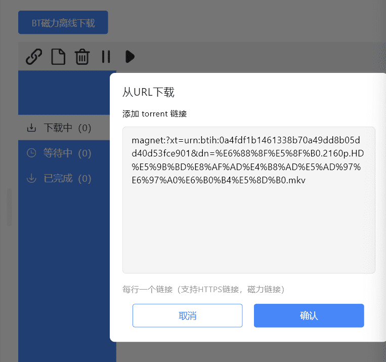 步骤3: 将网站找到的电影链接地址添加到“添加torrent链接”中