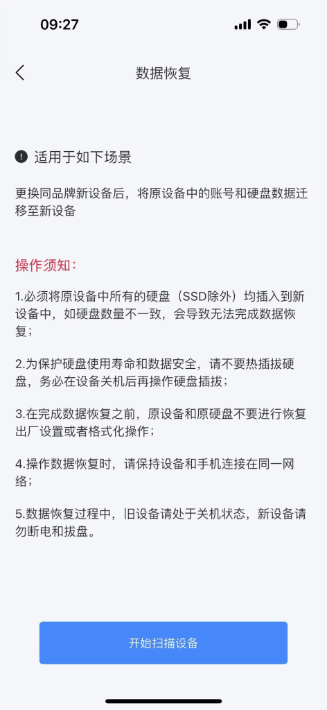 4.操作数据恢复时,请保持设备和手机连接在同一网络;
