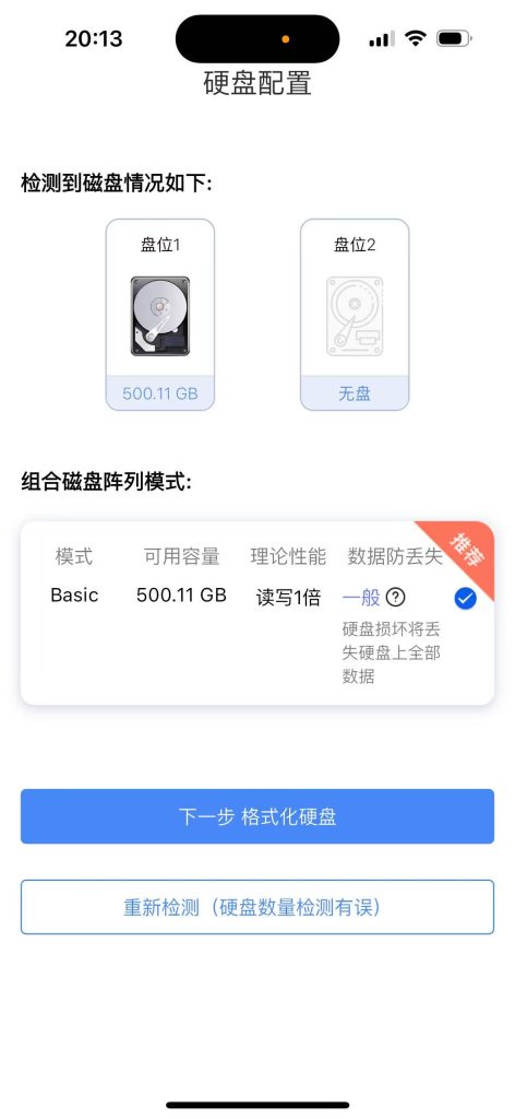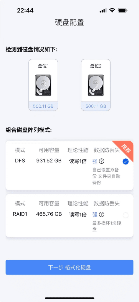 双盘时存储池模式可选择DFS模式和RAID1模式。(RAID1需要2块大小相同的硬盘)