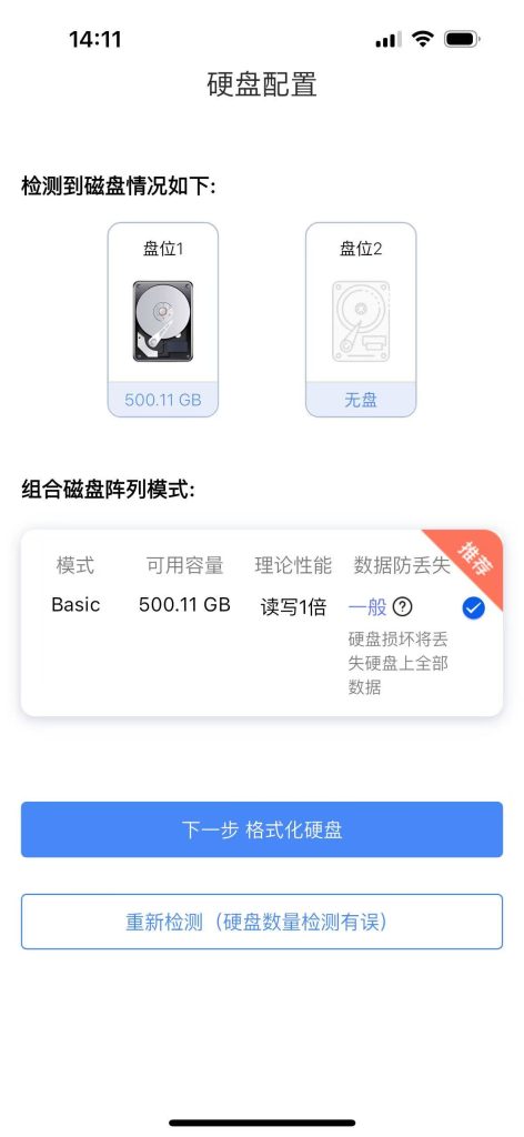 Basic模式:用户仅插1块硬盘、默认会采用此模式、此模式不支持双备份。硬盘损坏将失去硬盘上全部数据。实际可用容量为100%硬盘空间可用。