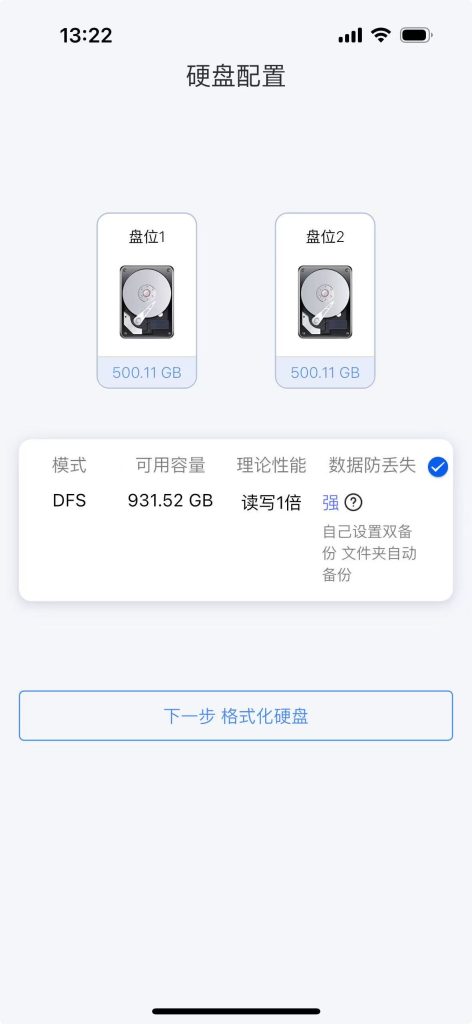 DFS模式:需插入2块硬盘、容量可不一致。DFS说明:用户自行对重要目录在APP中设置“双备份”。仅双备份用户设置的目录。DFS相比Raid1模式的全量双备份,既满足重要数据的安全需求,又能让硬盘使用率最大化。