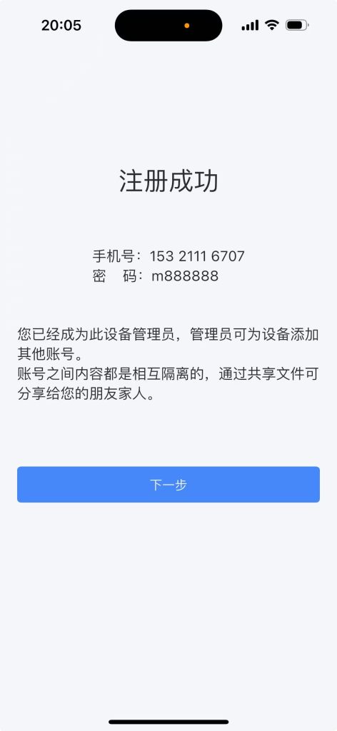 说明:填写手机号,验证码,密码后点击“注册”,提示“注册成功”,新设备管理员注册成功、下一步可进入APP应用主界面