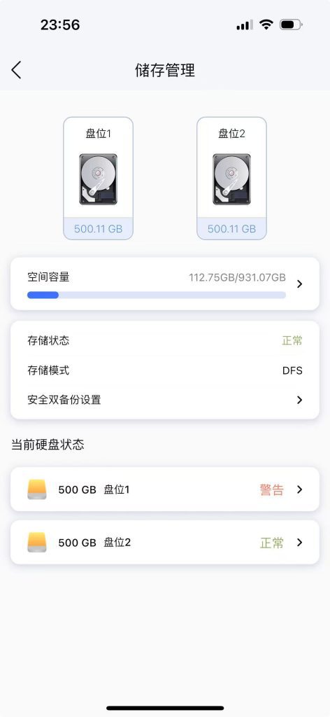 可查看硬盘数量,空间大小,存储模式,双备份设置,磁盘健康状态