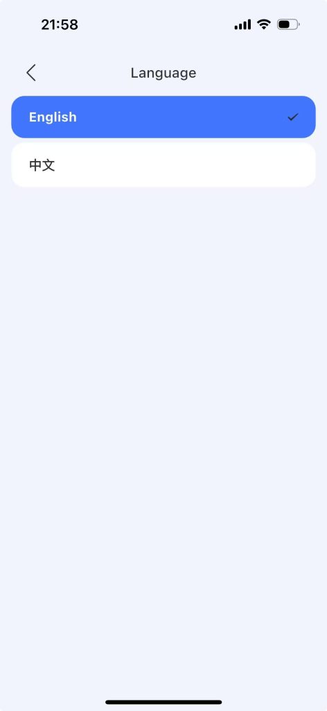 语言设置可设置中文和英文2种语言,设置某种语言后,APP中的所有文字均为所设置的语言文字显示