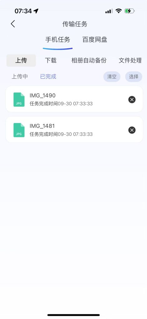 步骤3:点击传输任务按钮,进入传输任务页面,点击上传已完成页面下,查看上传完成的照片