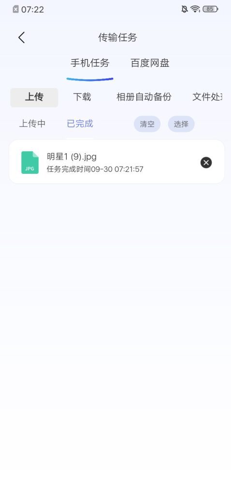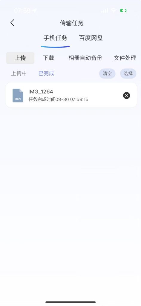 步骤3: 点击传输任务按钮,进入传输任务页面,点击上传已完成下查看上传完成的照片