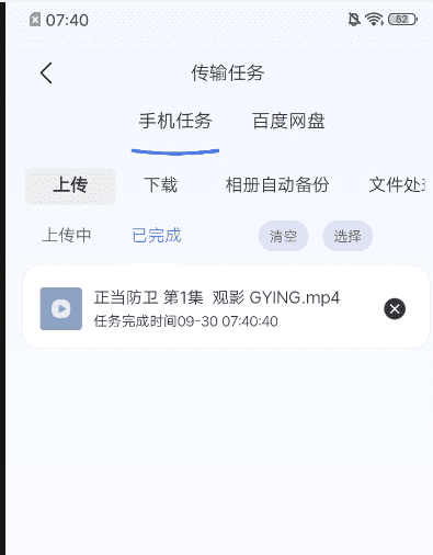 步骤4: 进入传输任务页面,点击上传已完成下查看上传完成的视频
