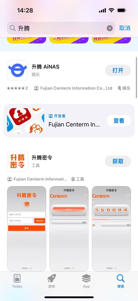 - 打开 AppStore 搜索“升腾”或者“Centerm”,找到升腾 AiNAS App;