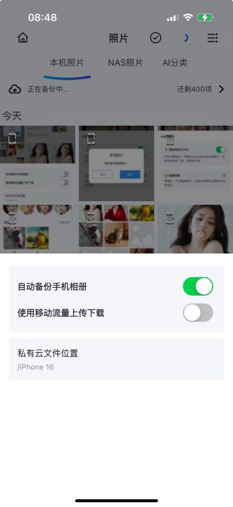 步骤4: 自动备份完后,“正在备份本地找相册(剩余192)”提示,不再显示