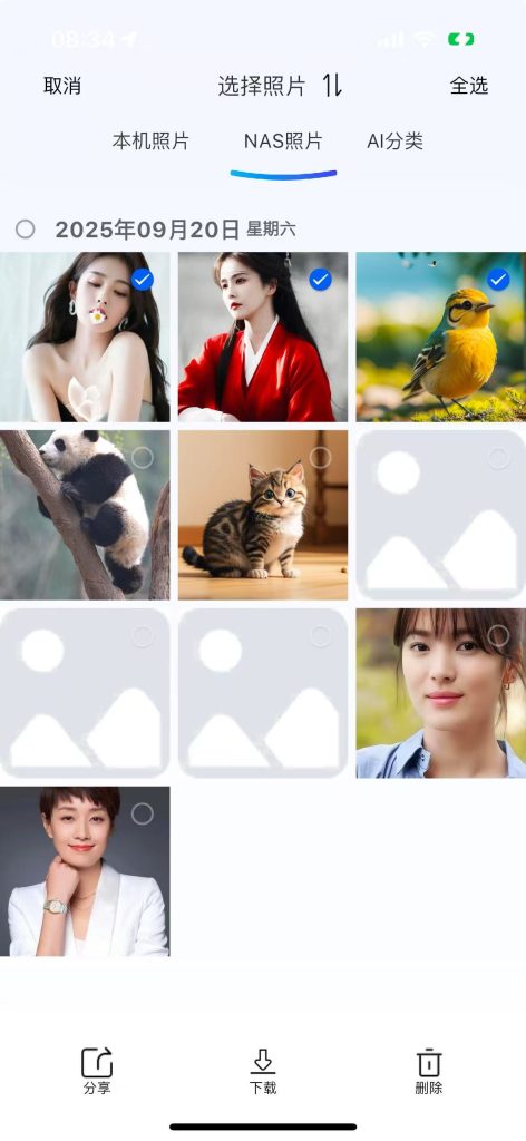 步骤1: 相册-“NAS照片”-点击“对钩”按钮,可单选/全选照片