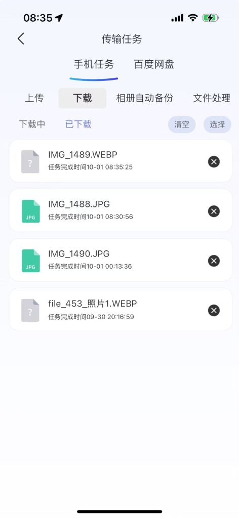 步骤4:点击“传送任务”按钮,在传输任务页面,点击下载-已完成查看下载完成的照片