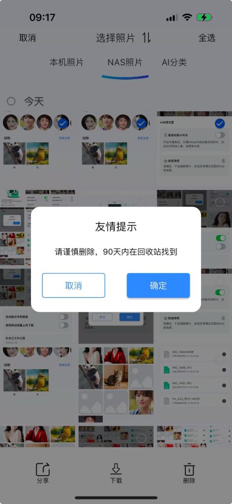 说明:删除NAS上已上传的照片,手机本地照片不会再重新备份用户可重新选择这些照片进行手动上传
